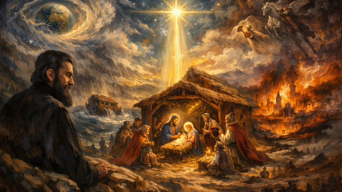 Părintele Arsenie Boca privea Nașterea Domnului, nu doar ca pe un eveniment istoric, ci ca pe o intervenție cosmică esențială care oferă un sens întregii creații, iar, ca să ne dăm seama de semnificația cosmică pe care o are Nașterea din Betleem, trebuie să o integrăm între marile referințe ale lui Dumnezeu la întreaga creație, fiindcă patru mari intervenții ale lui Dumnezeu fac lumea să aibă un temei, o explicație și un Sens eclatant! Acestea sunt: a) Creația lumii, b) Potopul lui Noe, c) Întruparea Mântuitorului și d) Sfârșitul lumii, aşa că intervențiile stihiale, după pricipalele Sale definiții se prezintă prin faptul că de două ori Dumnezeu este «iubire» şi de două ori «sfârșit», într-o viaţă reală. Aşadar, «Iubire» la zidirea făpturii şi la refacerea făpturii prin Hristos, iar, «Sfârșit» la potop şi la sfârșitul lumii! De aceea, devine necesar ca să acceptăm ordinea istorică a faptelor Lui Dumnezeu, care cuprinde: creația lumii văzute și nevăzute, din iubire și după spusa: ,,Eu sunt începutul și sfârșitul” (Apocalipsa 1, 8). Deși, Cel Preaînalt preștia totul, dar văzând, cât s-a înmulțit răutatea oamenilor, «I-a părut rău și S-a căit Dumnezeu că a făcut pe om pe pământ» (Facerea 6,6) și a zis: ,,Sosit-a înaintea feței mele sfârșitul a tot omul” (Facerea 6, 13). În felul acesta, «S-au deschis toate izvoarele adâncului și cascadele cerului» (Facerea 7,11) și a venit Potopul, când Dumnezeu Și-a dezlănțuit «căința», după care, din nou, Fața Lui Dumnezeu s-a făcut iubire: «Că într-atât a iubit Dumnezeu lumea, încât pe Fiul Său Cel Unul-Născut L-a dat, pentru ca tot cel ce crede într-Însul să nu piară, ci să aibă viaţă veşnică. Cel ce crede într’Însul nu este judecat, dar cel ce nu crede a şi fost judecat, fiindcă nu a crezut în numele Celui Unul-Născut, Fiul lui Dumnezeu, iar, judecata, aceasta este că Lumina a venit în lume şi oamenii au iubit întunericul mai mult decât Lumina, fiindcă faptele lor erau rele» (Ioan 3, 16-19).